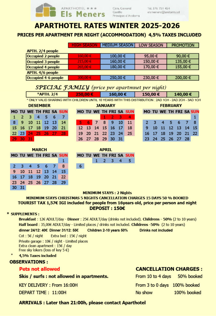 Don’t wait any longer to enjoy an unforgettable stay in our cosy flats in Canillo. Book now and guarantee your space in this idyllic corner of Andorra, where you will find the comfort, tranquillity and connection with nature that you are looking for in your holidays. Our team will be delighted to welcome you and make your experience memorable. We look forward to welcoming you at Aparthotel Els Meners!