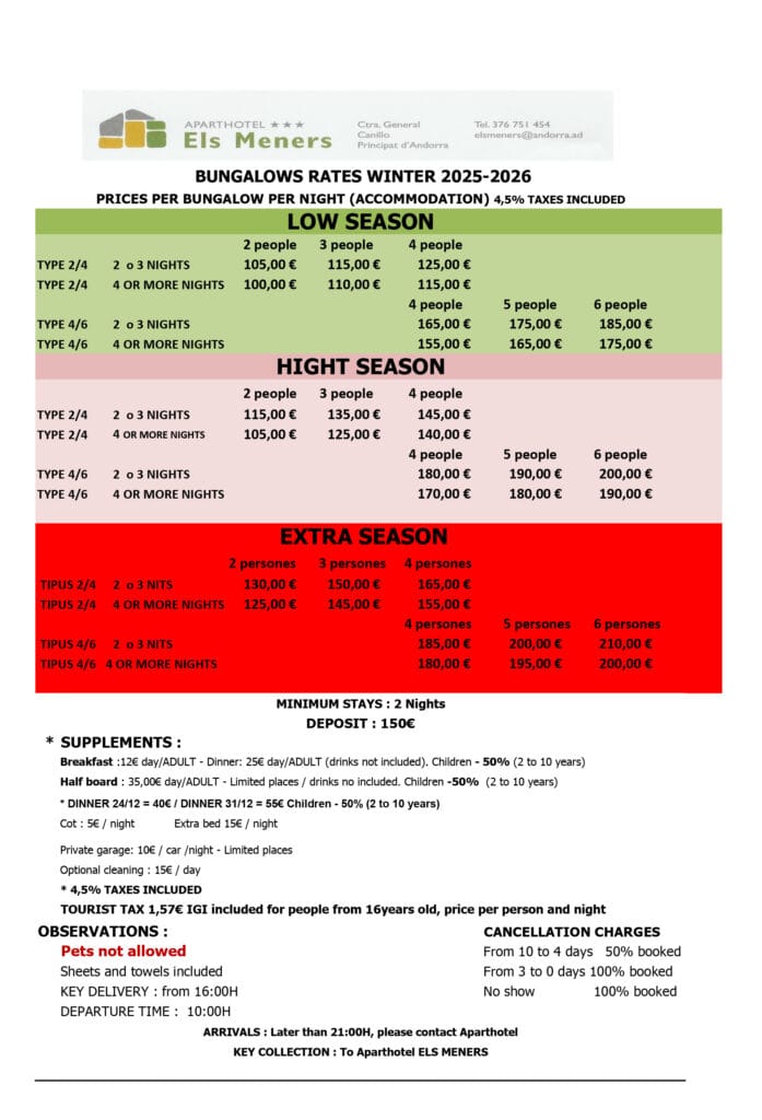Don’t wait any longer to live an unforgettable holiday in Andorra. Book now your bungalow in Grup Meners and discover the magic of the Pyrenees. Whether you are looking for a romantic getaway, a family adventure or a retreat with friends, our bungalows offer the space and comfort you need to make the most of your stay.